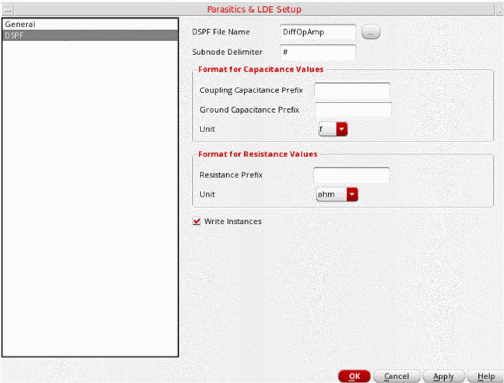 on the EAD toolbar or the EAD Browser toolbar and choose Generate DSPF File. The Parasitics & LDE Setup form is displayed.