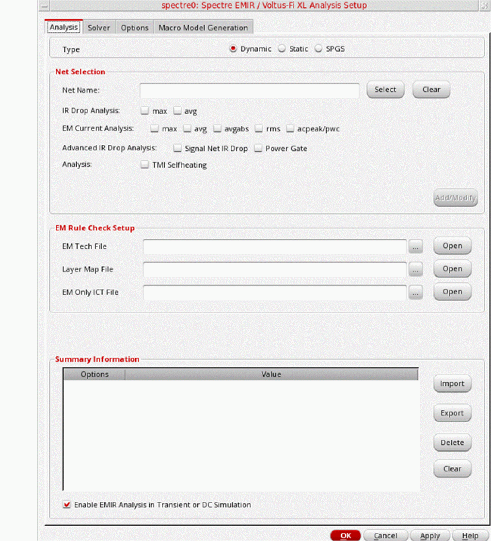 - Choose Setup – EM/IR Analysis to open the Spectre EMIR / Voltus-Fi XL Analysis Setup form.