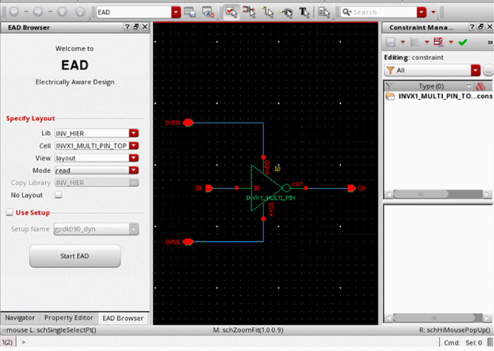 Virtuoso Layout Suite opens. - Select a net in the EAD Browser of the Schematic.