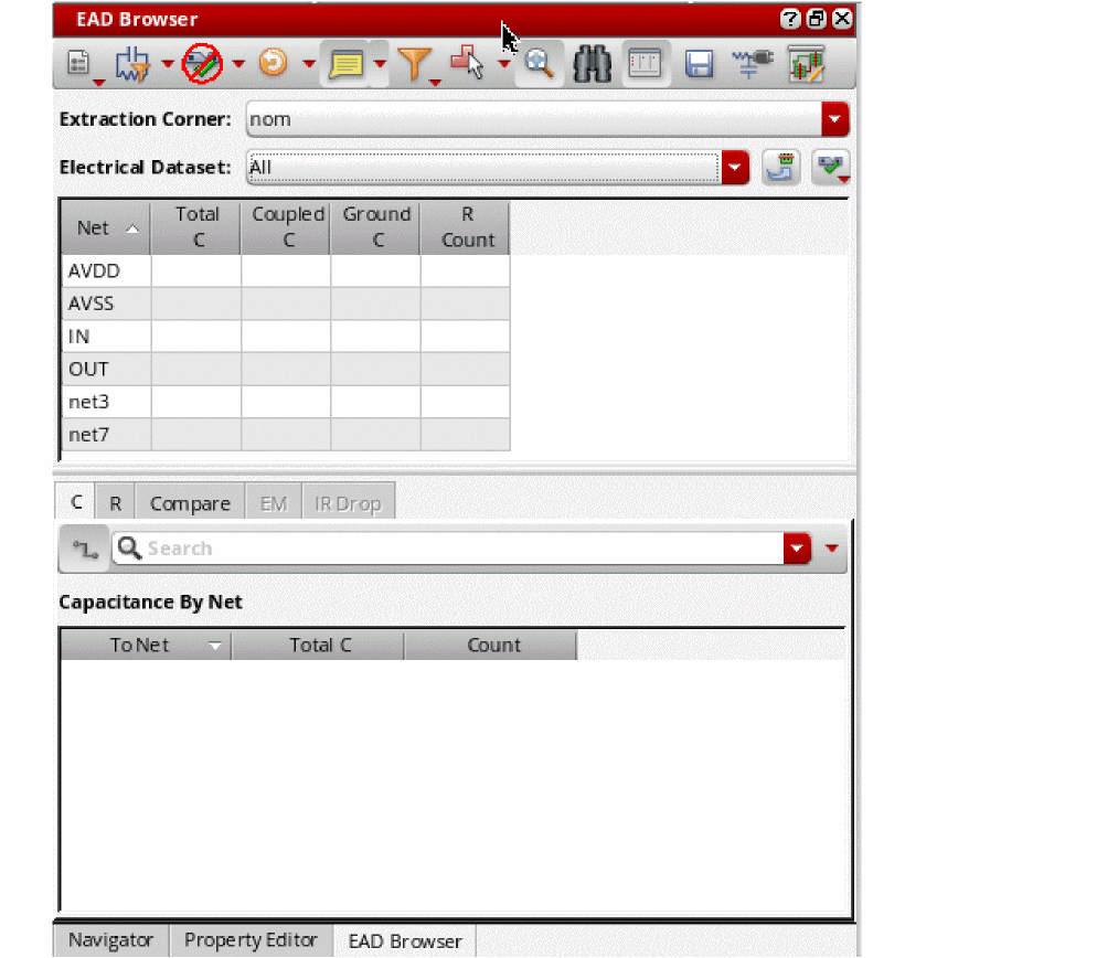 By default, the Capacitance By Layer and Capacitance by Node tables are not visible on the C tab of the detail pane they require detailed knowledge of the layout topography which is not visible to the circuit view. You can display them by setting the detailedParasiticTables environment variable to t or by selecting the Detailed Parasitic Tables check box on the Environment tab of the EAD Options form.