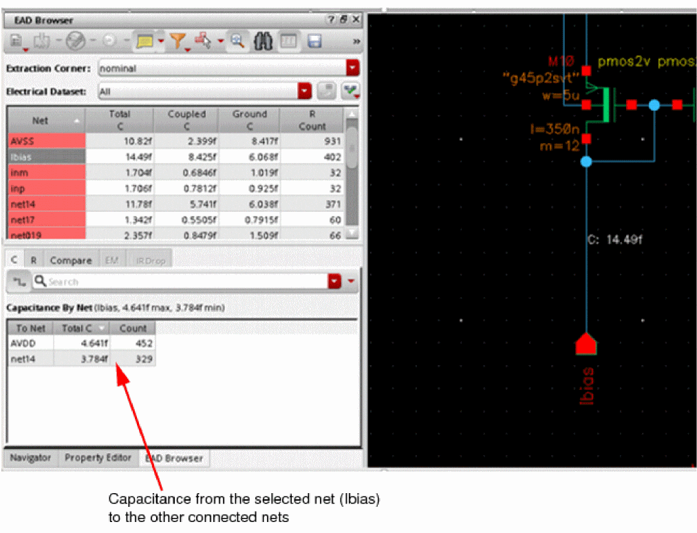 Similar to resistance, you can interactively view coupled capacitance values for one or more nets selected on the schematic.