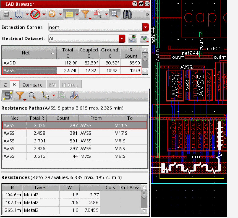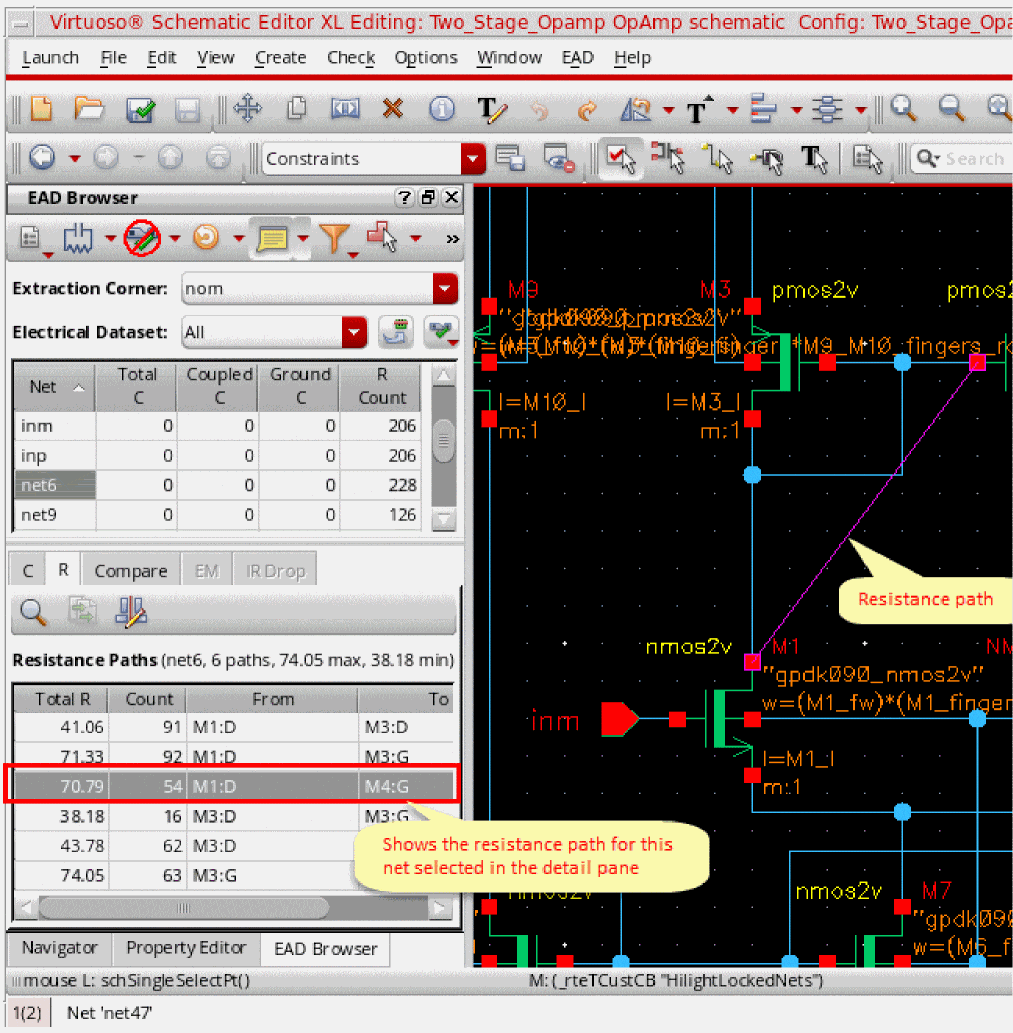 The following example shows the resistance path annotated in the layout for the selected net in the EAD Browser of the Schematic.