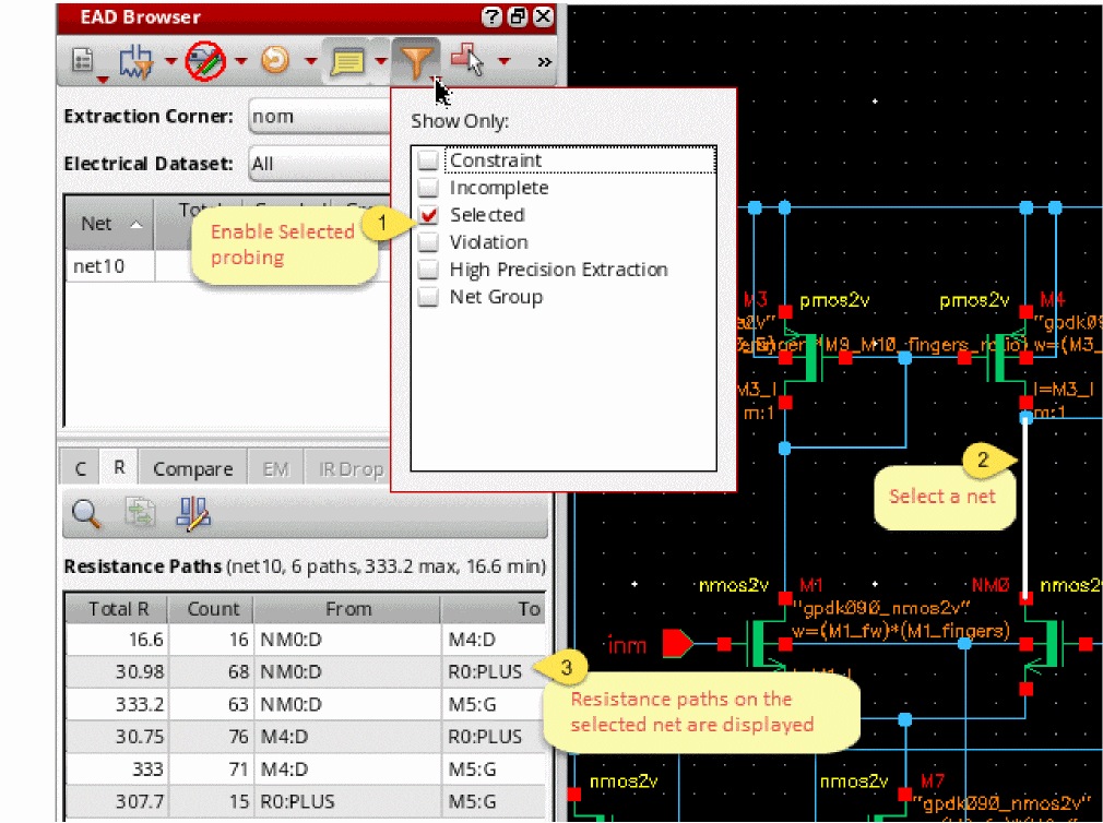 Probing Resistances for Nets, Terminals, or Instance Terminals Selected on Schematic