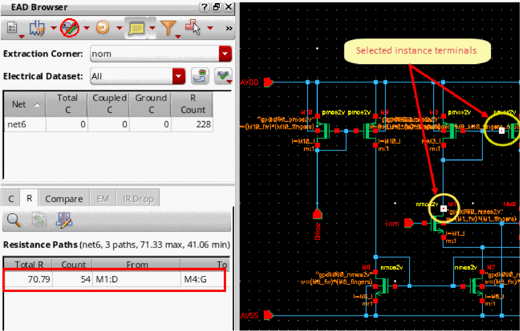 - Select an instance terminal or a terminal to view all the resistance paths from or to that terminal on the connected net