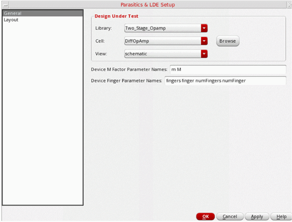 The Parasitics & LDE Setup form is displayed, as shown below.