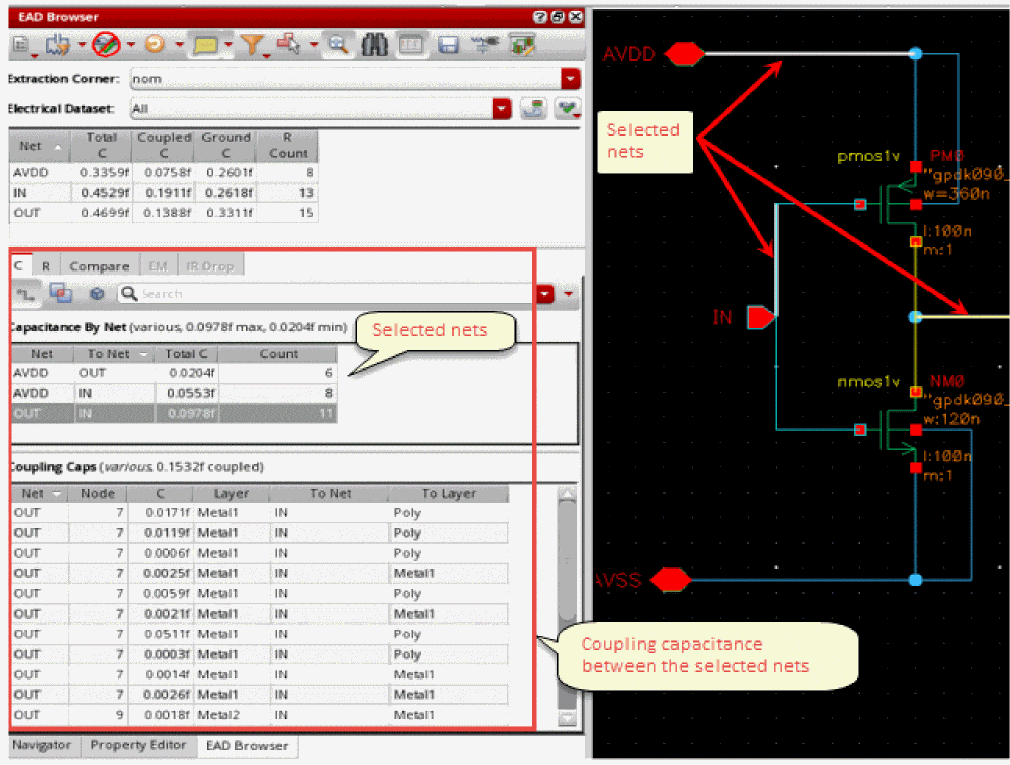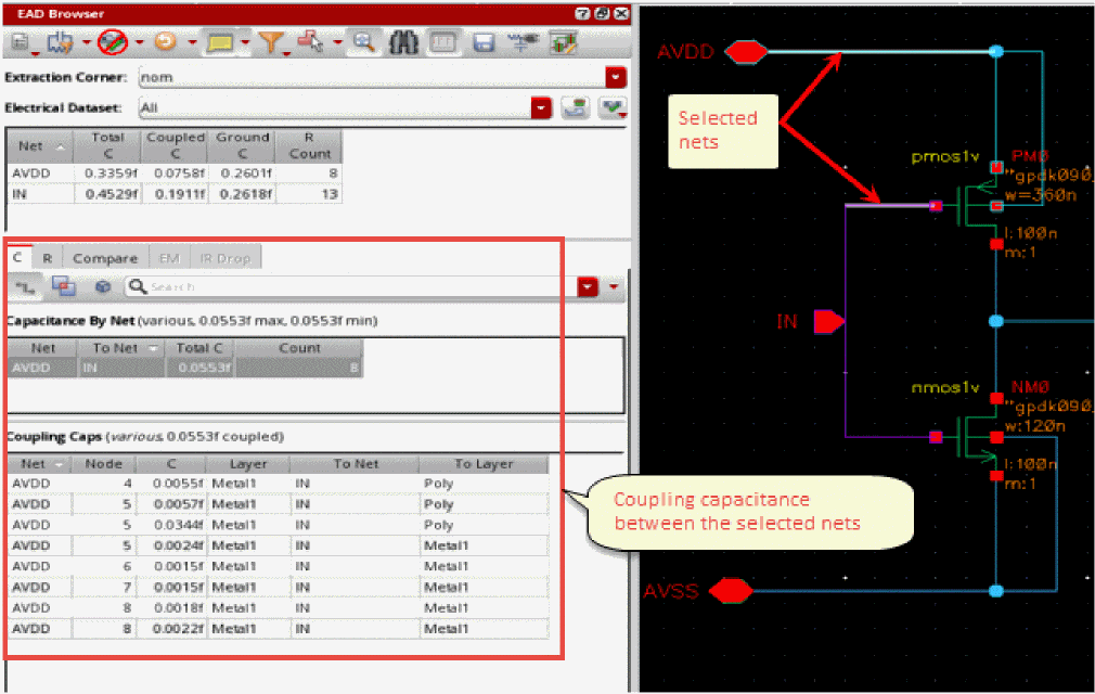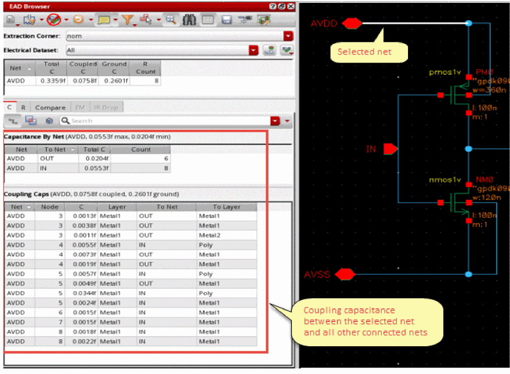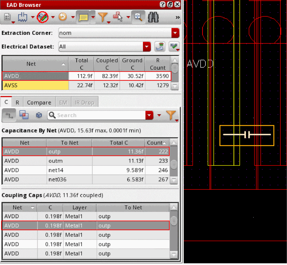 The following example shows the coupling capacitance between the netsAVDDandoutphighlighted in the Layout.