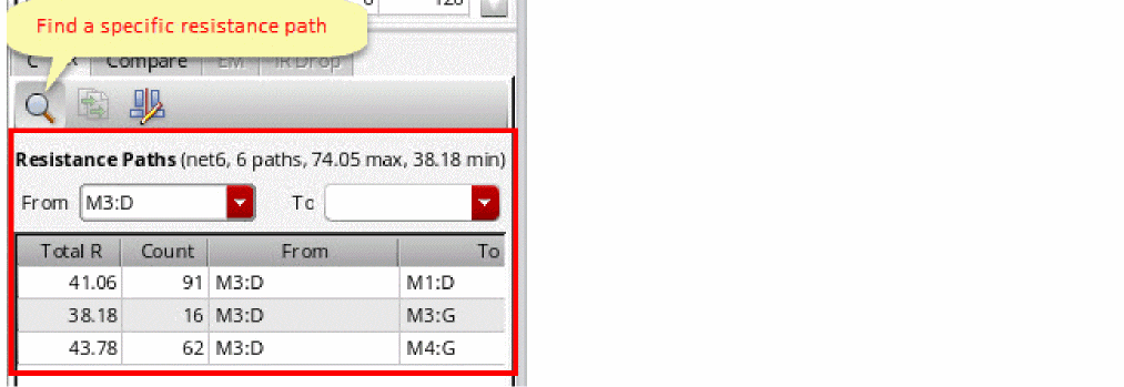 You can search for specific resistance paths between two instance terminals, or beginning from or ending at the selected instance terminal. For example, the figure given below shows the resistance paths from M3:D.