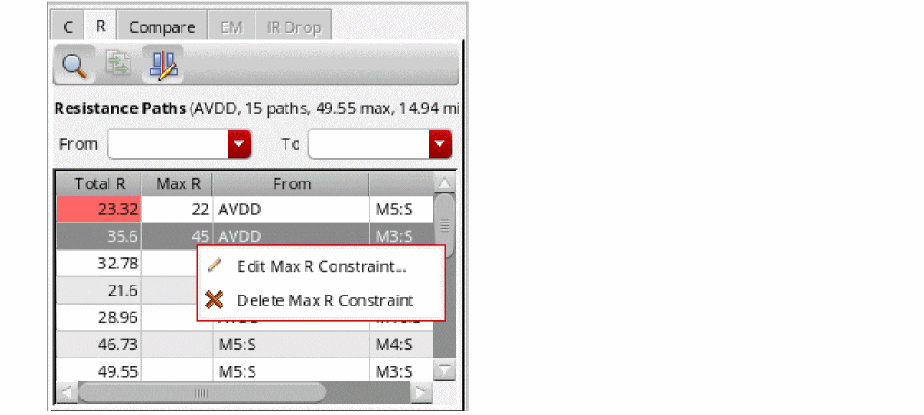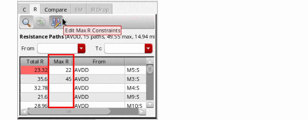The Count column in the resistance paths table is changed to Max R. This column shows the existing constraint values, if defined in the constraint view. Otherwise, the cells are blank.