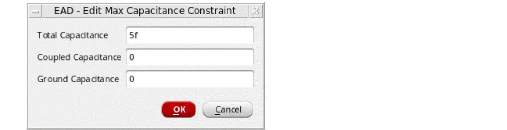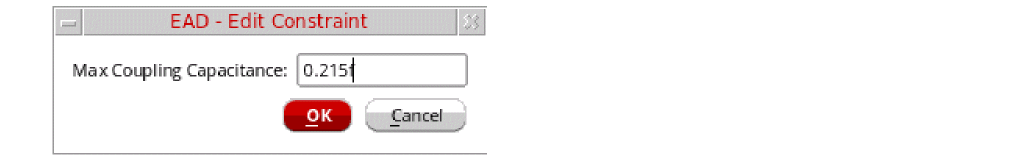 - Right-click a net in the Capacitance By Net table in the detail pane of the EAD Browser, and to choose the Edit Max Coupling Capacitance Constraints command.
