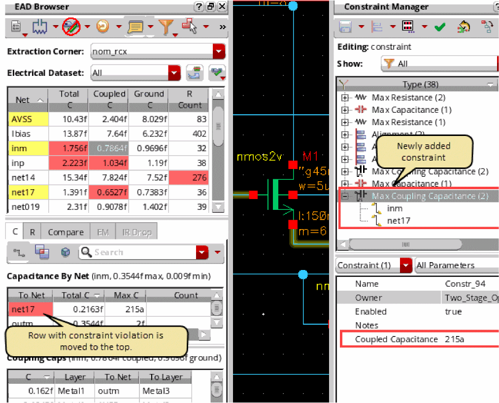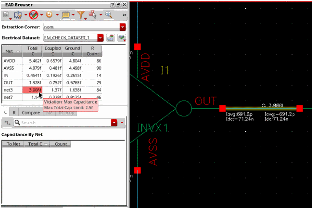 The effect of updated parasitics or constraints can be seen in the EAD Browser. For example, after you add or update the Max Capacitance constraint on a net, if the total capacitance value for the net is more than the constraint value, it is highlighted as a violation, as shown below.