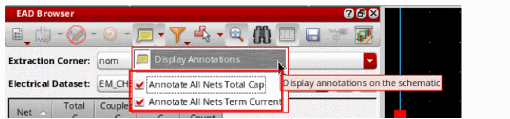 By default, the display of annotations on the schematic is enabled. Select a net in the EAD Browser and use the commands shown below to view annotations.