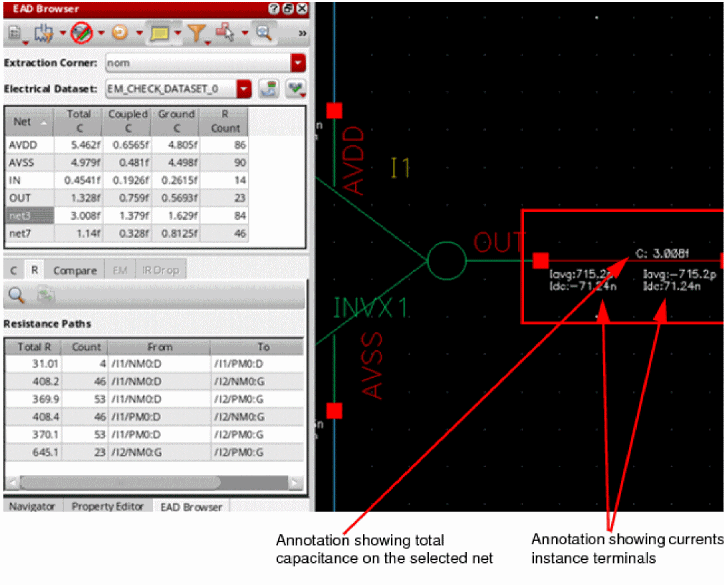 Open the EAD Browser, and run parasitic extraction by using the Extract Parasitics for All Nets command.