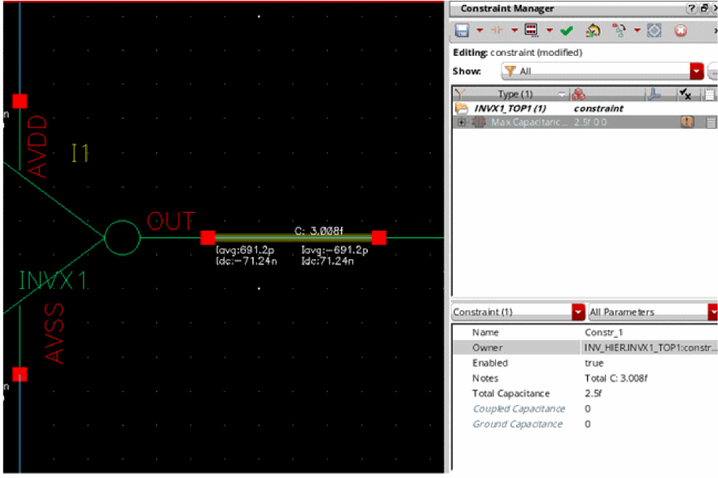 If you need to apply the same constraint value to multiple nets, select the nets in the EAD Browser and use the Edit Max Capacitance Constraints command to create or edit the constraint.You can also use the Delete Max Capacitance Constraint command from the context-sensitive menu of the selected net on the Summary pane to delete the constraint.