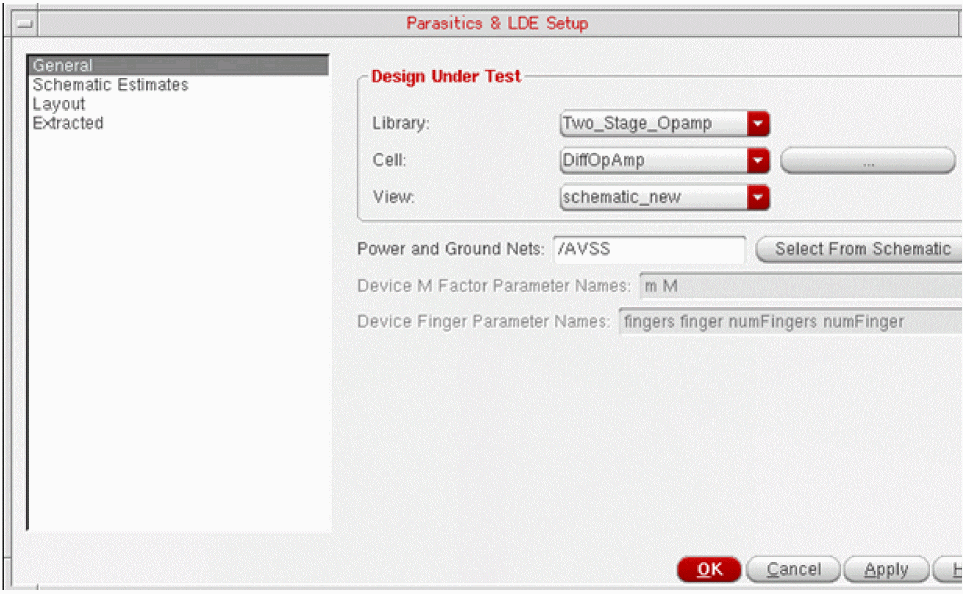 For more details about the Setup Parasitics & LDE form, see Parasitics/LDE –Setup in the Parasitic Aware Design User Guide. -