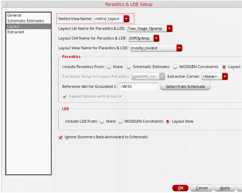 The simulation mode in ADE Assembler is automatically changed toLayout (Parasitics/LDE). This is the mode in which ADE Assembler runs simulations with parasitics included in the netlist.A netlist created from a layout view merges the parasitics from both the layout view and the schematic view. While doing that, preference is given to the parasitics in the layout view. For example, if you have specified both resistance and capacitance for a net in the schematic view, whereas, only capacitance for that net in the layout view, the netlist with get the capacitance value from the layout and resistance value from the schematic. To use only the parasitics from the layout view and to ignore all the estimated parasitics from the schematic, set the mixSchEstWithLayoutParasitics environment variable tonil.