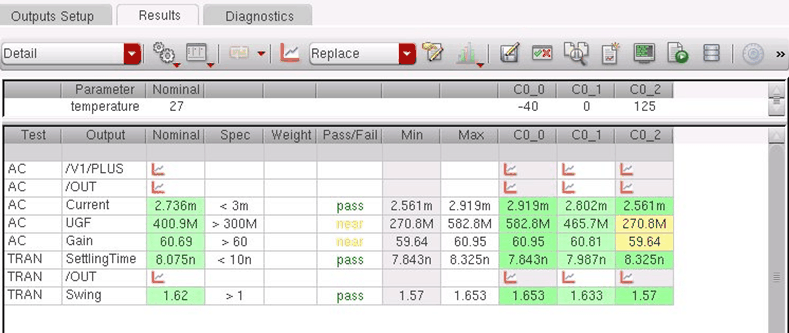 After the estimated view is built successfully, run a new simulation for your design and view the results to analyze how the desired output specifications are met. The color codes on the Results tab indicate the pass, fail, or near pass status, as shown in the figure below.