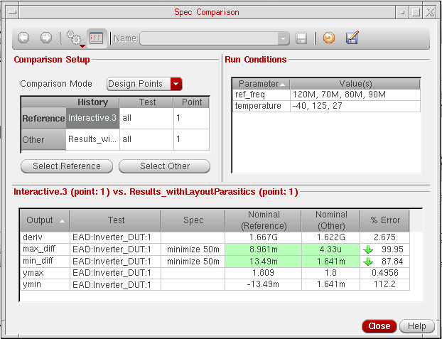 You can compare the results with that of the previous simulations, which were run without using the parasitic estimates. For this, you can use the Spec Comparison form in ADE Assembler.