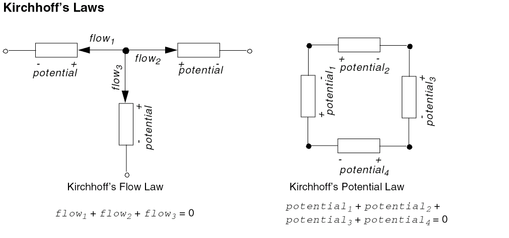 These laws assume that a node is infinitely small so that there is negligible difference in potential between any two points on the node and a negligible accumulation of flow.
