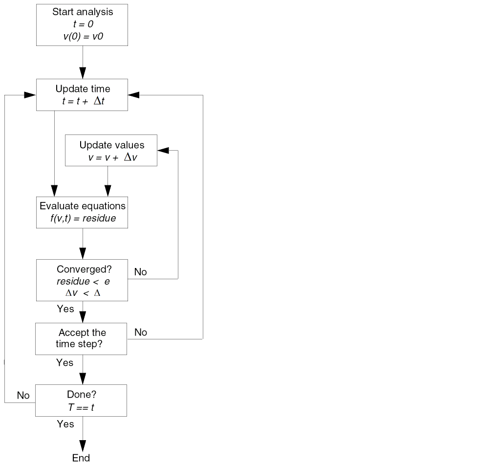 After you specify the structure and behavior of a system, you submit the description to the simulator. For analog systems, the simulator then uses Kirchhoff’s laws to develop equations that define the values and flows in the system. Because the equations are differential and nonlinear, the simulator does not solve them directly. Instead, the simulator uses an approximation and solves the equations iteratively at individual time points. The simulator controls the interval between the time points to ensure the accuracy of the approximation.