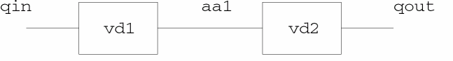 This higher-level component is described by module vquad, which creates two instances, named vd1 and vd2, of module vdoubler. Module vquad also defines external ports corresponding to those shown in the schematic.
