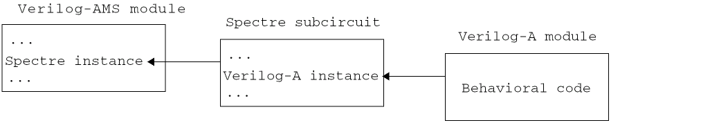 Users of AMS Designer can instantiate Spectre cells in their Verilog-AMS code. By using the ahdl_include statement, those Spectre cells can, in turn, instantiate Verilog-A modules. This situation, which users of Spectre libraries often encounter, is summarized by the following diagram.