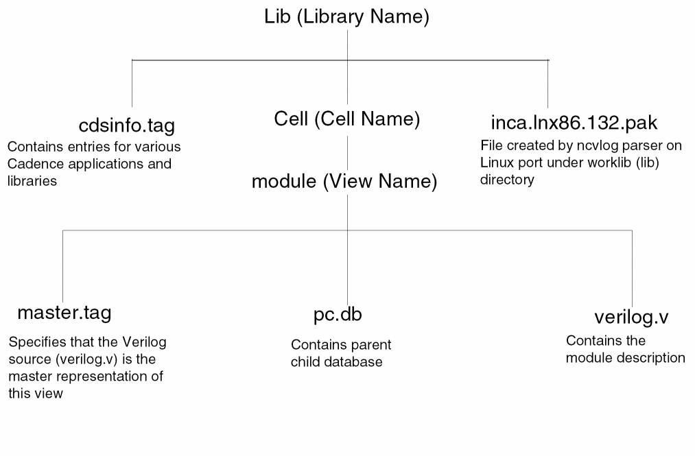 Verilog In uses the ncvlog parser to parse and translate the Verilog files into an Intermediate Representation (IR) that is stored in a 5.X architecture library. During analysis, for each module in the Verilog file, ncvlog creates a cellview in the 5.X library. The generated cellview has the following structure: