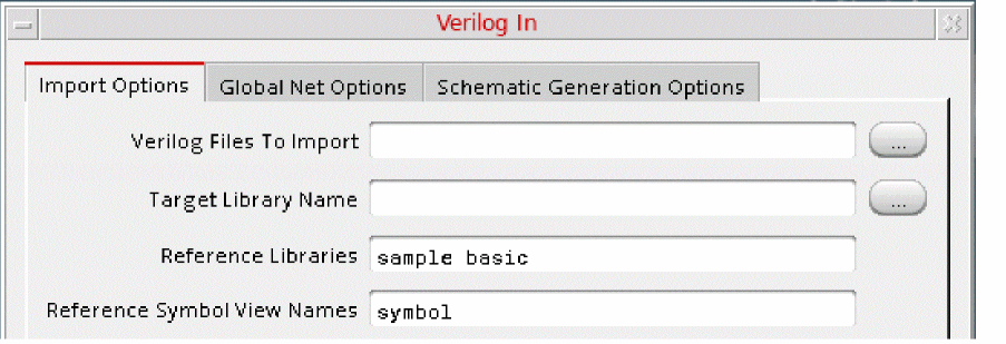 Verilog In imports the design into the Virtuoso Studio Design Environment format and places it in the specified library.