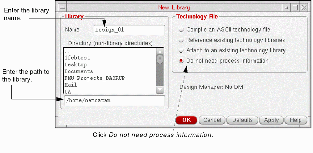 If you create a new library in the New Library form without creating a cds.lib file beforehand, the Library Manager tool creates a cds.lib file in the directory where you started VHDL In. The Library Manager tool creates entries in the cds.lib file for each library or design that you add or create in the CIW.