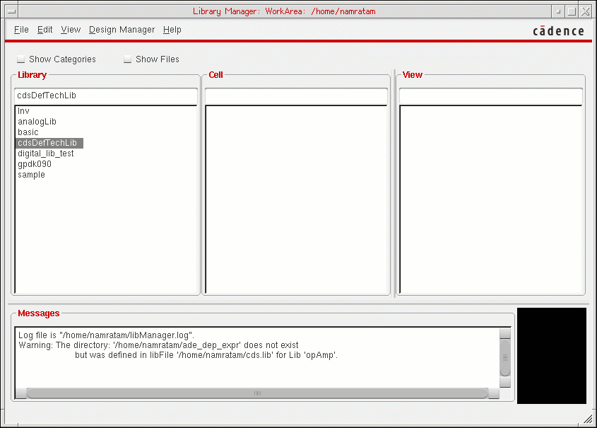 In the following example, the Show Categories option is turned off and you can see references to the five required libraries (basic, sample, US_8ths, std, and ieee) and user-defined library cdsDefTechLib.