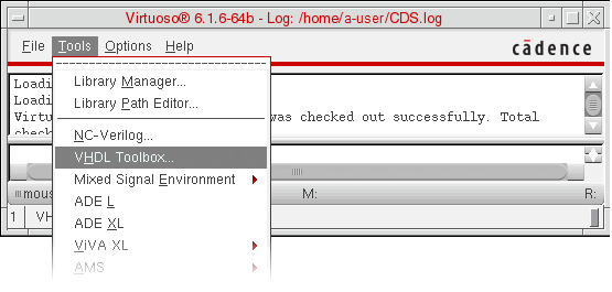 If you use other Cadence applications (and have more than one cds.lib file) in addition to VHDL In, be sure that you start Virtuoso® Design Environment from a directory that contains the cds.lib file you want to use for VHDL In.