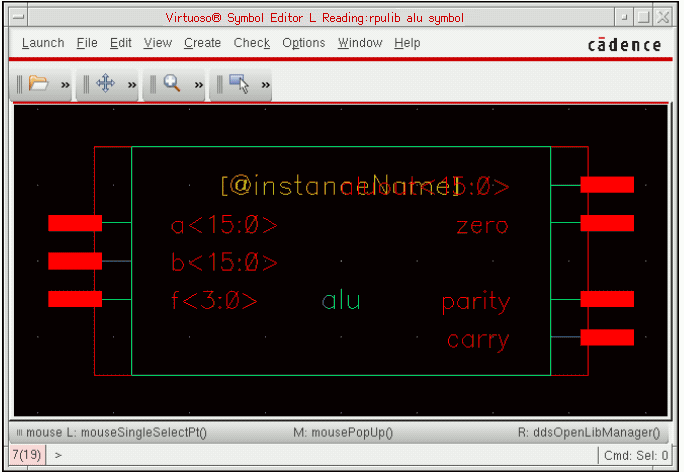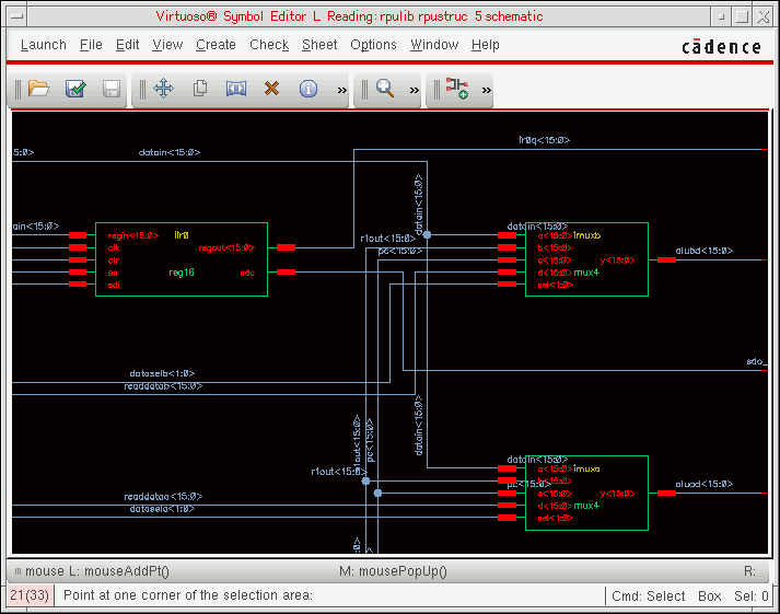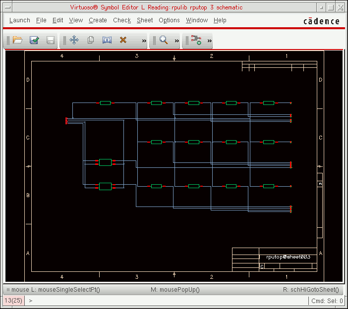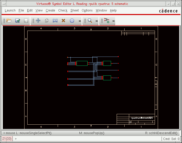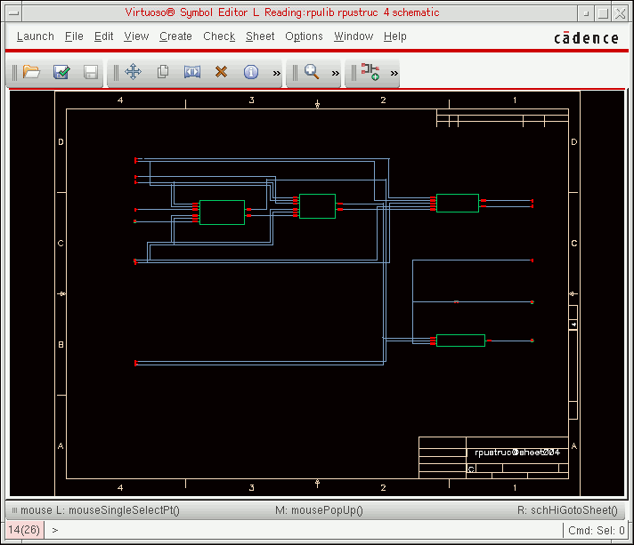 From the Library Manager double-click the schematic view for rpustruc@sheet004. This sheet displays rpustruc and some I/O pins.