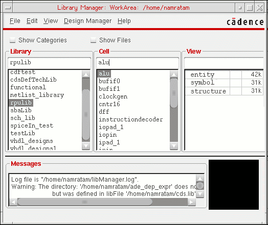 This sample design is included in the Cadence software /tools/dfII/samples/vhdlin/Test3, where <dfII_install_dir> is dfII installation directory. Copy this design directory into your own account. In the following example, the RPU design starts in the ~/vhdlin_examples/rpu_design directory.