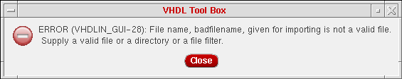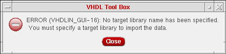If you click either OK or Apply on the VHDL Import form without filling in the Target Library Name field, the following error message appears.