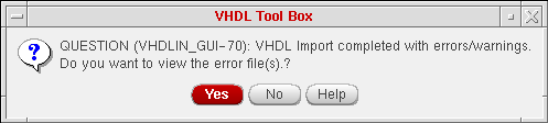 When the import process finishes with errors or warnings, the following dialog box opens. If you click OK, the VHDL Tool Box status window opens, displaying the contents of the first error or warning file. You can also view the log file from this status window.
