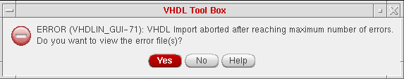 If the import process reaches the maximum number of errors, the process ends and the following dialog box opens. If you click OK, the VHDL Tool Box status window opens, displaying the contents of the first error or warning file. You can also view the log file from this status window.