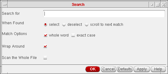 Search opens the following form, which prompts you for a character string to search for.