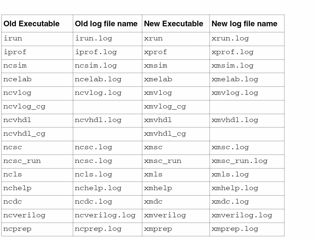 The following table lists the changes in the executable and log file names when using the Xcelium simulator: