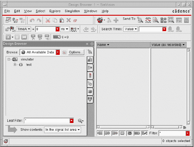 The Simulation window is part of the Cadence® SimVision Analysis environment, which is a unified graphical debugging environment for Cadence simulators.