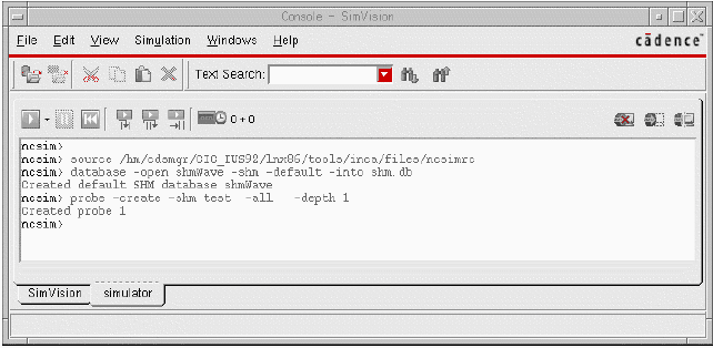 The Simulation window opens when you perform an interactive simulation. In an interactive simulation, you can select in the VHDL Toolbox window the options to compile, elaborate, and simulate the design. The Console - SimVision and Design Browser SimVision windows are displayed after the design has been successfully compiled and elaborated.