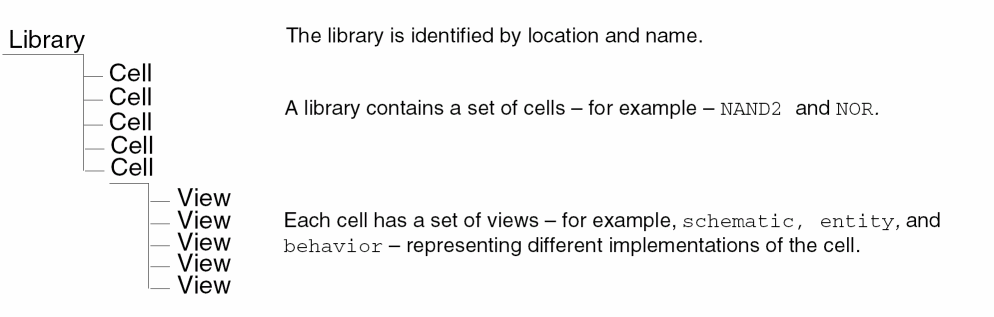Cadence design libraries are organized in three levels shown below.