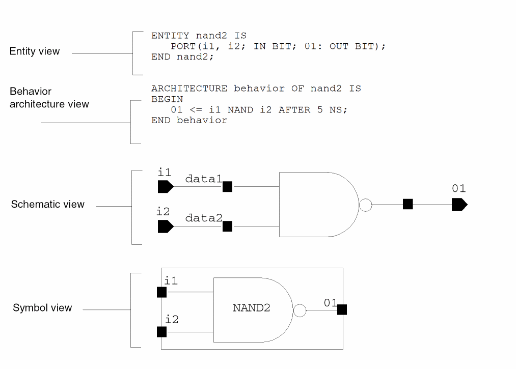 The following example shows textual and symbolic views of a nand2 gate.