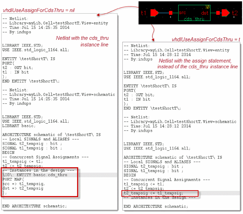 The following figure illustrates the netlist with the cds_thru instance line and the netlist with the assign statement.