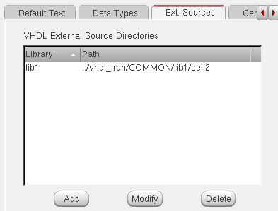Lets you specify external VHDL sources to be used during netlisting. The Ext. Sources tab contains the VHDL External Source Directories table in which you can specify libraries and their directory paths. For more information, see Support for External VHDL Source Files. |