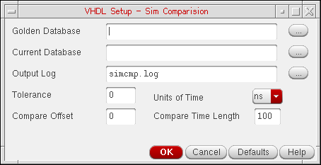 Choose Setup – Sim Comparison to open the VHDL Setup - Sim Comparison form in which you can specify names of the Simulation History Manager (SHM) databases that you need to compare and the name of a output log.