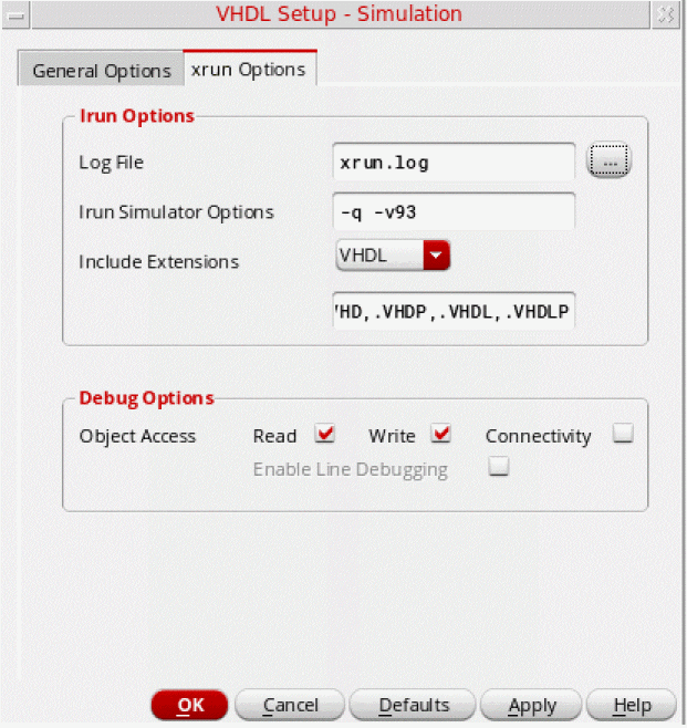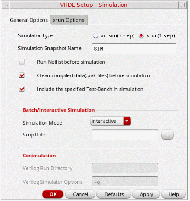 xmsim simulator. Therefore, the Xrun Options tab is disabled. To enable the Xrun Options tab, set the vhdlSimSimulator SKILL variable to xrun. When you enable the Xrun Options tab, the Cosimulation section of the General Options tab is disabled.When using the xrun utility, you need to set xrun specific options in addition to the options given in the settings done in the General Options tab. The various options on the Xrun Options tab are:
