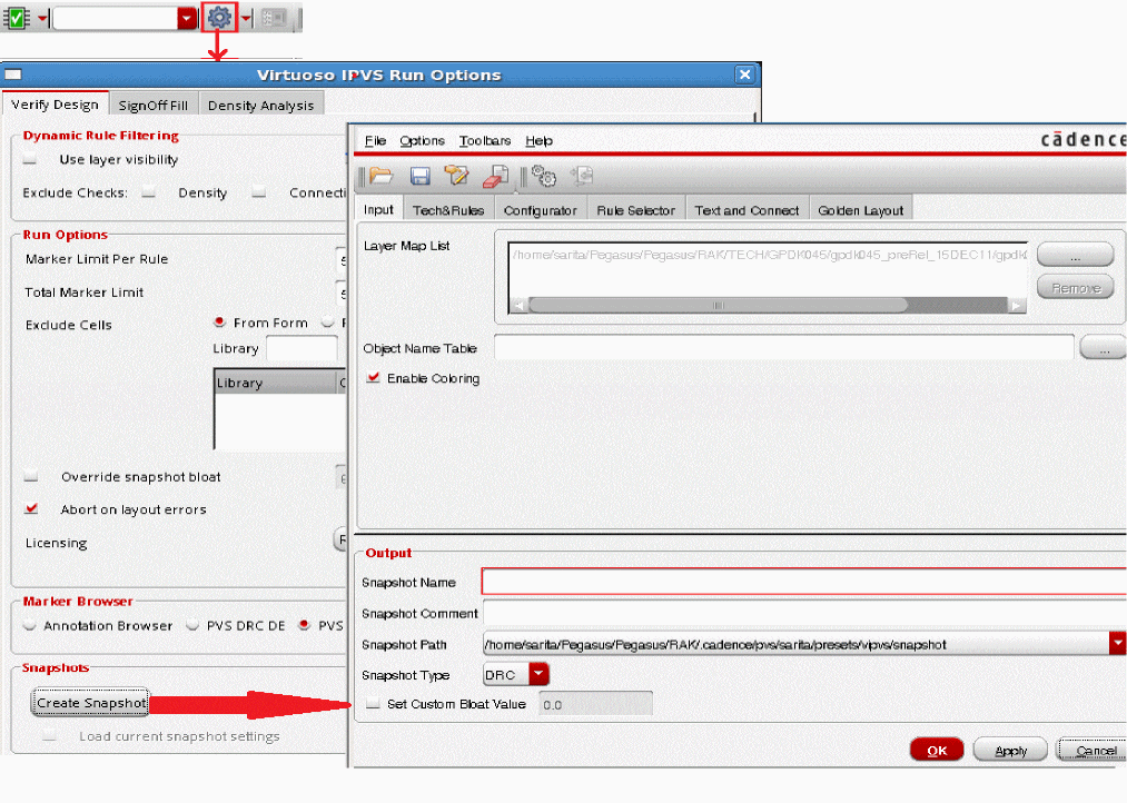 To create a snapshot, click VIPVS Run Options icon, click Create Snapshot button on Virtuoso IPVS Run Options form and create snapshot using the Virtuoso IPVS Snapshot Creator form.