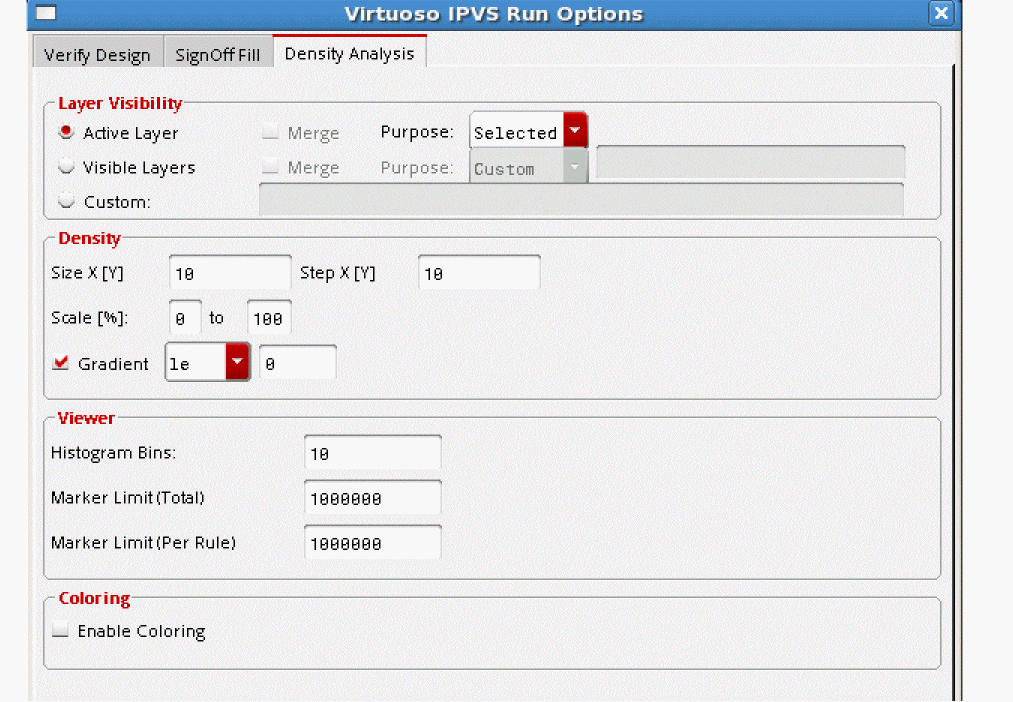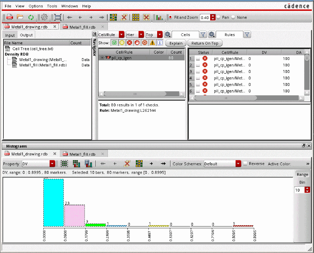Density analysis generates density results from VIPVS toolbar for required layers. Rule deck is not required. Results are shown in the layout viewer as density heatmap and in PVS Results Viewer as histogram.