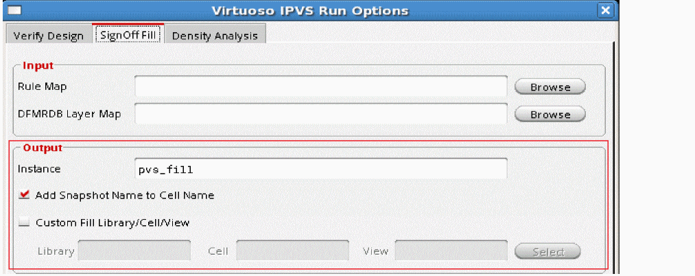 - Open Virtuoso IPVS Run Options form and go to the SignOff Fill tab.