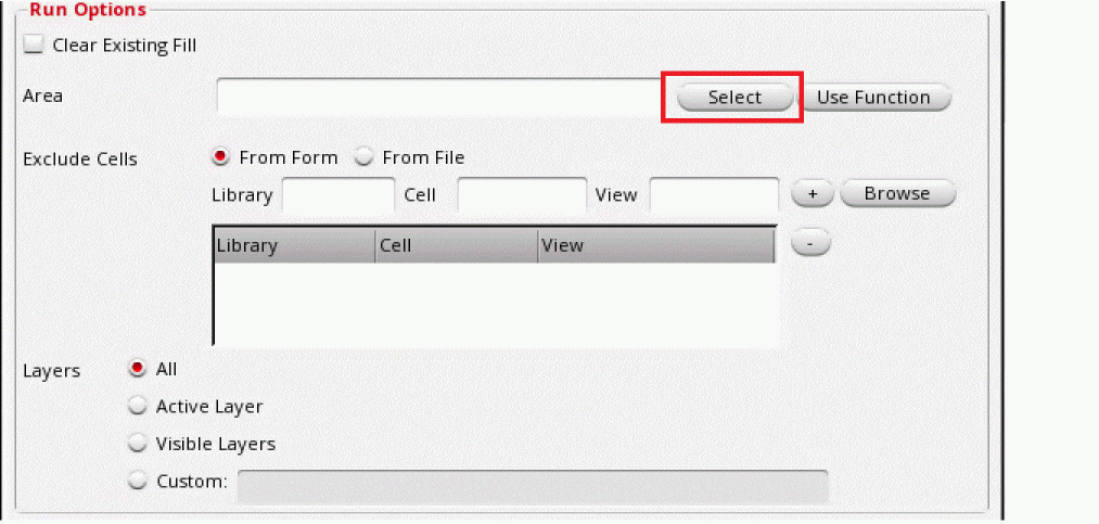 In the steps above, the SignOff Fill was run for all layers. On similar lines, you can run this for active layers, visible layers, custom layers and for specified area by making appropriate selections in the Virtuoso IPVS Run Options form. For more details see, Run Settings for SignOff Fill.