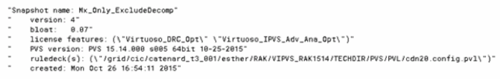 Following figure illustrates Mx_Only_ExcludeDecomp snapshot header information. It indicates that Virtuoso_DRC_Opt and Virtuoso_IPVS_Adv_Ana_Opt licenses are required for Virtuoso IPVS to run successfully.